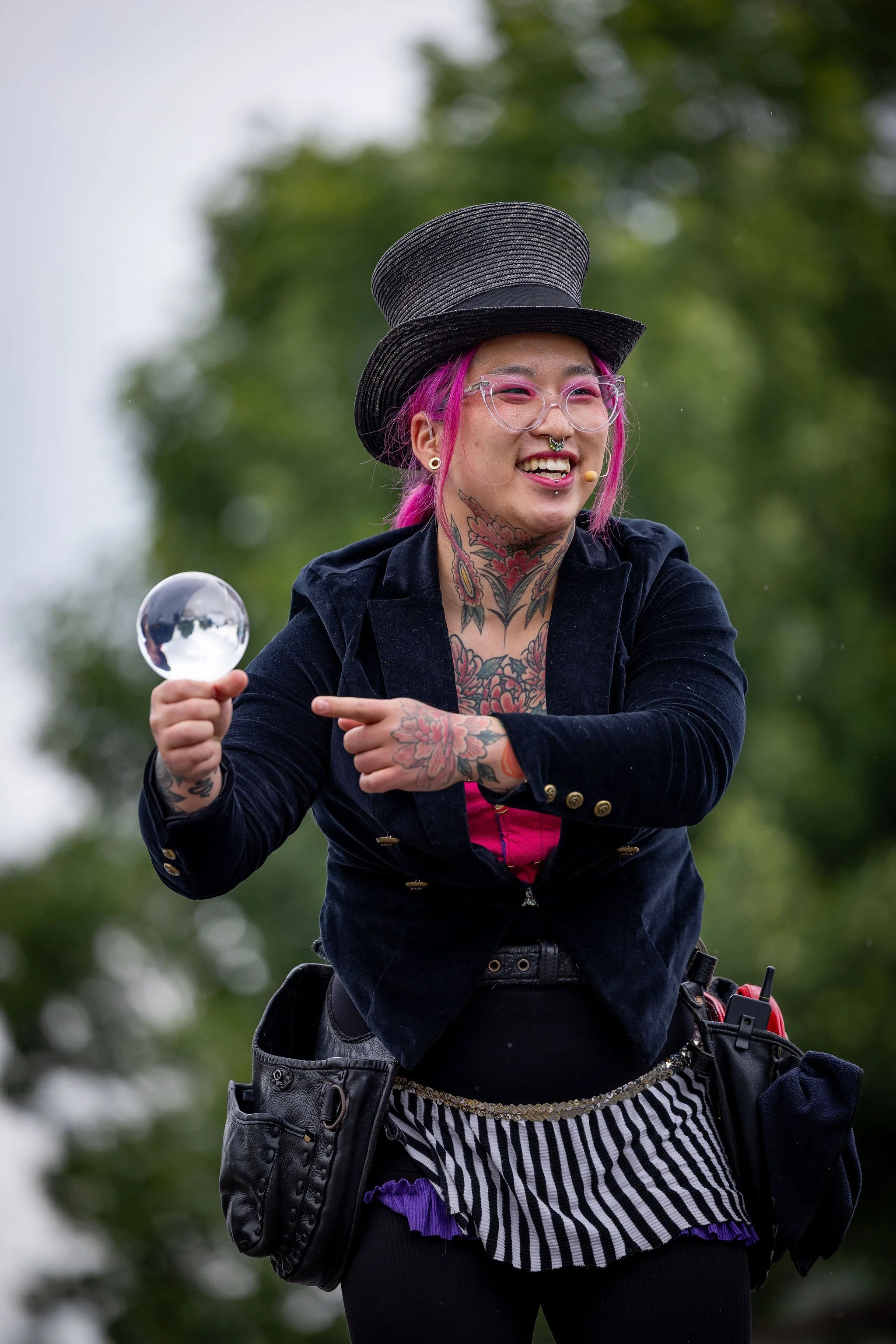 Known for dynamic, interactive shows, Jay Flair combines magic, comedy, and circus artistry into high-energy performances that captivate from start to finish. Her work balances technical skill with humor and charm, creating moments that feel both impressive and approachable. Jay excels at reading a crowd and shaping each show to the space and audience in front of her.